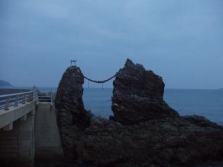 野母崎町にある夫婦岩 高速道路を一路長崎へ、長崎市内へは道路が新設されており市内(グラバー邸近く)へは容易に行くことが出来た。 国道499号を走り野母崎町に入り右手に東シナ海を見る海岸線を走行途中にあった。 |