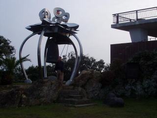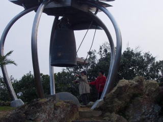 権 現 山 公 園 夫 婦 鐘 ここは夕日の美しいところで、県立公園になっています。山頂には写真の様な鐘突がある。 夫婦鐘を突く義母と家内 |