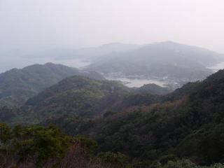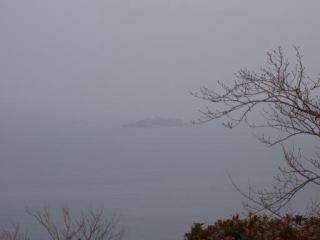 | 権現山展望台から端島(軍艦島)を望む、 野母崎町の先にある権現山展望公園(標高198m)、ここは昔遠見番所があった場所であり、展望台の下には今も「のろし台」が残っています。 端島(軍艦島)や高島などが望める眺望の良い場所ですが今日は端島が霞んで見える。 |