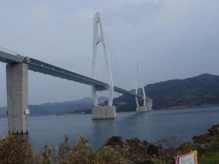 大 島 大 橋 野母崎町から北へ約90km 長崎県西彼杵半島とその西海上に位置する大島、その「大島」町と「崎戸」町を結ぶ 全長1,095mの斜張橋です。平成11年に開通 |