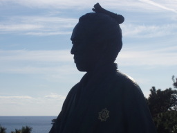 | 高知、桂浜の立つ坂本龍馬の像である。 遠くアメリカ方面を見据えているとか、又右手は懐に入れ何を握っているのか・・・・? |