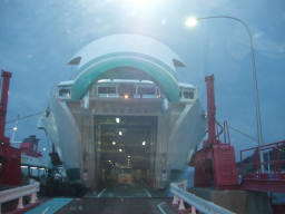 いよいよ四国ともお別れだ 八幡浜港からフェリー「さくら」へ乗船し、別府港へゆく。 フェリーの船首部分が大きく口を開けて車の乗船を待っているようだ 「どうぞ中へお入り」と。 |
