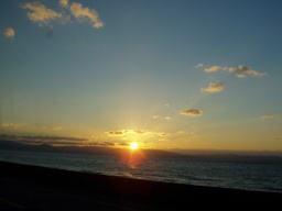 有明町を走行中の夕日(明日天気になぁーれ) 目的のキャンプ場についてのは2000をまわっていた。 管理棟に行ったが留守である、 (後で資料を見ると管理人1700までの勤務となっているようだ) Pキャンする場所が解らず適当な駐車場所を見つけそこで・・・。 |