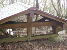早朝と言っても8時頃、竜洞山の山頂 近くに屋根が見えたので近寄ってみると 湯気のようなものが漂っていた。 炭焼きの残り(煙)かなと暖かく感じられた、 その裏に回りびっくり |