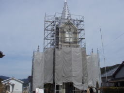 崎津天主堂 残念ながら工事中でした 掲示板によると アルメイダ神父により1569年(永禄12年) 2月23日に建てられ、ここを中心にして、 キリスト教は天草に栄えたのでした。 |