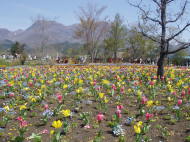 久住の山々をバックに花公園の芝サクラ |