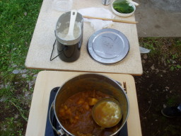 カレーはジャガイモ等も皮をむき、炒め料理をした。又、飯ごうでご飯を炊き、初めて最初から最後までやり通した。
