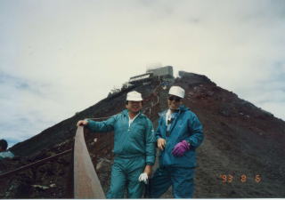 その次は、 職場(自衛隊福岡地区病院)で知り合った歯科医官(徳永先生)である。 趣味が登山ということでよく一緒に山に出かけた、中でも福岡県の糸島半島に野北牧場(昔黒田藩お抱えの馬牧場)の岩場では、ロッククライニングまでは行かないが岩登りの練習を二人で日暮れまで。 出会いは別れの始まりという、先輩は鹿児島県出水野田郷の診療所へ転勤していった、でもたまに遊びに国鉄(普通列車:蒸気機関車牽引で8時間)で出かけて行き遊び廻った。 鹿児島、指宿と楽しかった。そこで身に付いてのが旅行である旅、北アルプスへ行くときはバラバラに出かけるが上高地で待ち合わせ槍が岳に登った。 何時も時刻表を手に持っていた、時刻表を見て旅行をしていた次は何処へ行こうか何時何分の列車に乗って何処で乗り換えて・・・・・・と。 いまは、熊本市で歯科医院を開業されている。たまには遊びに行っては、昔の話に花を咲かせている「どこどこの山は良かった。もう一度登りたい」等々の話を延々と続ける。 平成5年、年には勝てないと言いながら、60才の大台になる前に富士山へとの夢を達成させた。(まだ富士山測候所が有るときであった) |