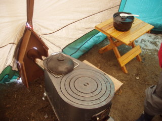 3ポールスクリーンタープ内の写真 薪ストーブとテント外へ煙突を出す枠(枠を設置することによって外からの風を防ぐことが出来た) タープ内はこの薪ストーブで十分に暖を取ることが出来た。 |