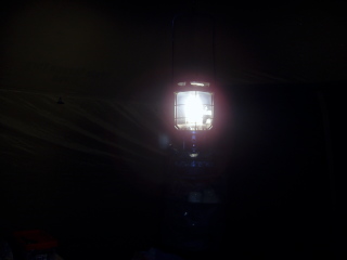 ガソリン式(コールマン2000-750j) さすがに燃焼式のランタン、炎が小さくなることなく明かりを灯していた。 |