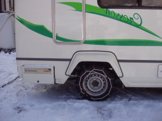 念のため、ゴムチェーンを巻いて帰ることにした。走りはさすがであるが、ごとごとと音が気になる走り。 | |