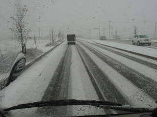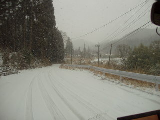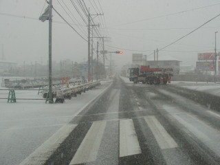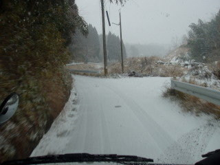 1月6日出発の日、午前中から天候が心配でした、急ぎ準備をして10時頃から天候は最悪、最も雪が降っている時に出かけた、交差点でも多くの車が最徐行運転 この様な様子を東北及び北陸地方の人が見たら何と思う事やら、九州では大変珍しい光景なんですよ(雪景色は) |