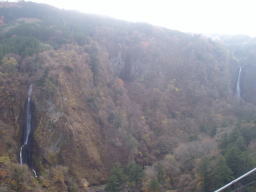今回は吊り橋の中程まで歩き、ここから見る滝をカメラに納めた(右が震動の滝、左は不明) |
