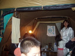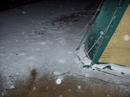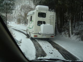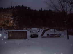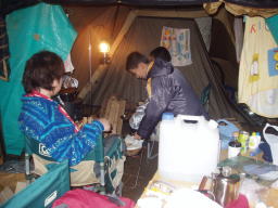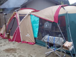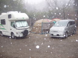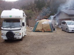 | 夜中、大分風が強くなり始めたようだ、車の方はぐっすりと眠っていた。 モトヤンのHPから 「マックはずっと薪ストーブの番。俺は寝ようとしましたが、 風が強くて寝れません。12時頃でしょうか?突然の突風。 スクリーンタープが飛びそう!それからずっとテントを支え ていましたが、4時頃でしょうか?更に凄まじい風が・・・ もうダメ折れそう。皆を起こして急いでスクリーンタープを 撤収。なんとか免れましたが、本当にダメかと思いました。 この夜の最低気温−8度。」 と、大変な目に遭っていようとは、4時半に携帯電話で起こされテントへ行き荷物の整理、 5時半頃には風も静かになりモトヤンとマックはキャンカーの中で熟睡 |