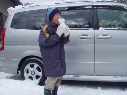 | 雪だるま、新雪で作ったものお茶目たっぷりです。 | リヤトランクの横に乗っている雪だるま | なめて見せる、大器 |