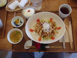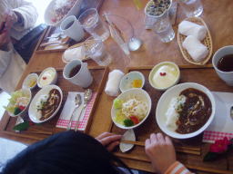 | 福岡を出て、先ずは昼食です、南小国に「茶のこ」という店ここで食事 子ども二人は、ハヤシライス一人前を二つに分けてもらって食事 大人は、右に写真の料理です(名前を忘れてしまいました、すみません)でもとても美味しかったですよ。 |