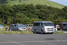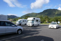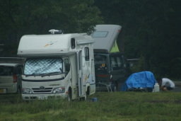 | 朝の駐車場、至る所で朝食の準備やら食事中の風景 |