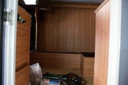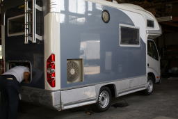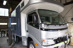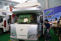 | 平成23年2月6日 幕張メッセで行われる「キャンカーショー」に出品する「クレア」を見に出かけた、家から1時間20分でナッツの本社につく。そこにはまさしく「クレア」が作業員の人から綺麗に磨き上げられていた。 一寸中を見せてもらった。 |