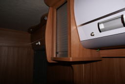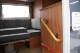 | エントランス、左に下駄箱及びサブバッテリのメインスイッチ並びに電圧モニター | エントランス、右には手すり 奥はダイネット・ソファー |