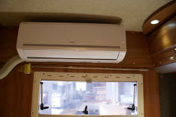 リヤのセミダブルベッドに家庭用エアコン 電源は発電機及び外部電源 |