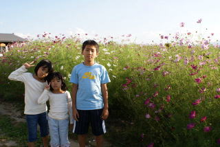 コスモス畑の前にて |