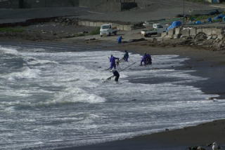 まずは、広尾を目指した走った、まもなくすると海岸で何かをしている人達に出会った、何だろうと車を止めて見ていると、かぎが付いた長い棒で盛んに海岸に流れ着いた物を引き寄せている、昆布であった。