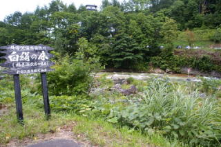さらに進むと、北湯沢温泉の河原が違うのに気が付いた「白絹の床」と書かれた看板に「緑色凝灰岩の露床」と書かれている、観光協会の目玉なのか???