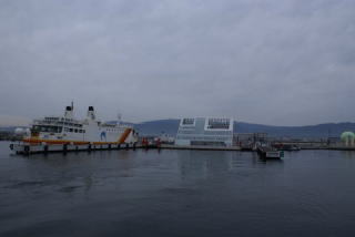 9時発のフェリー大間には1040に接岸、1時間40分の船旅。でも新造船は双胴船でウオータジェットで推進するこの船函館青森間を1時間40分で結ぶ、早い36ノットとは早い。 |