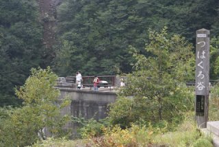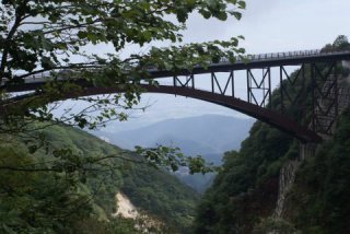 | 「つばくろ谷」ここは昭和34年に建設された橋を40年の歳月で撤去され、新しい橋が横に出来ていた、ここに着いた時硫黄のにおいが鼻を突く、古い方の橋跡から新しい橋を見るポイントが絶景なのである。 |
