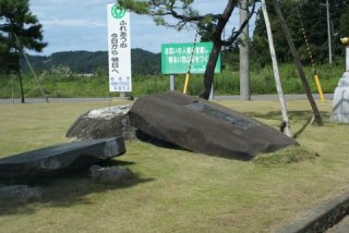 | 倒壊したままの碑 | 仮設プレハブ | |
