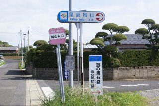 | ここの道の駅の案内板に載っていた、星鹿城山へ向かった。星鹿港横を走り抜け狭い道を進むと、標識がありその通りに進む、「こんな道を?」と思うようなたんぼ道である。 |