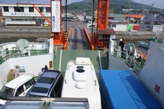 鬼池からのフェリーが入港した、フェリーはバスやトラックに乗用車などを満載にしていた。