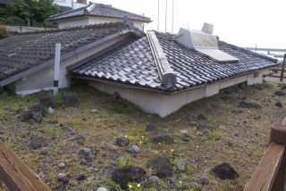 家の軒先までも、土砂が溜まっている。 |
