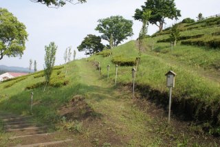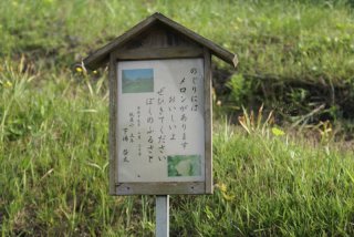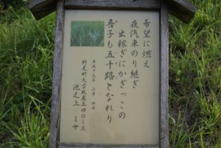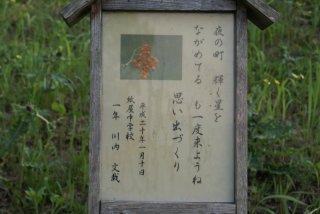 道の駅横に、小高い丘(忠霊塔)があり登り道には、地元の小学生から大人までの短歌が設置されていた。 |