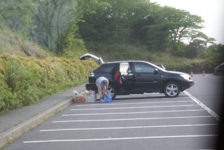 トランクを開けボトルに、水をくみ入れていた。 |