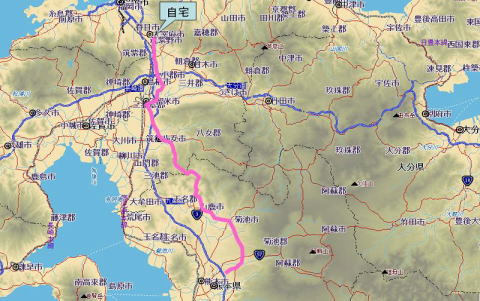 高速道路を使用せず一般国道を走って帰った、菊池市・山鹿市・八女市・久留米市等の都市を走ったので遅くなった。通常は高速道路を使用して1時間10分であるが、国道使用では4時間近く掛かった。