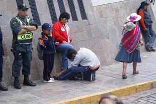 銃を腰にぶら下げて睨みをきかせているポリス、その横で靴磨きをしている若者、また赤子をおんぶしている原住民の女性 |