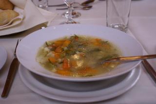 昼食は、前菜が野菜スープと鶏の唐揚げは アラマンサス(ゴマみたいなもの)を振 りかけられていた。