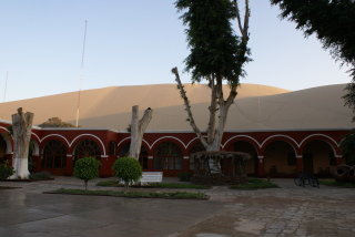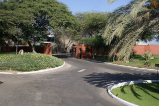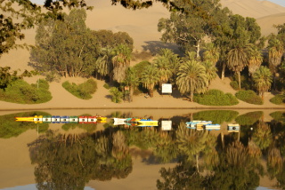| 5時半に起きる、昨晩現地ガイドが「ホテルは砂漠の中のオアシス」と言っていたのを思い出し中庭に、周りを見てびっくり砂漠である、外に出てみると池があるガイドの言うとおりであった。 |